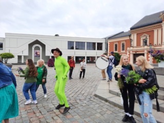 Pantomimos teatras A nuo Anikės aikštės iki Senojo turgaus ves iškilmingoje eisenoje, grojant diksilendui Five piece jazz band ir drebant senamiesčio langams.